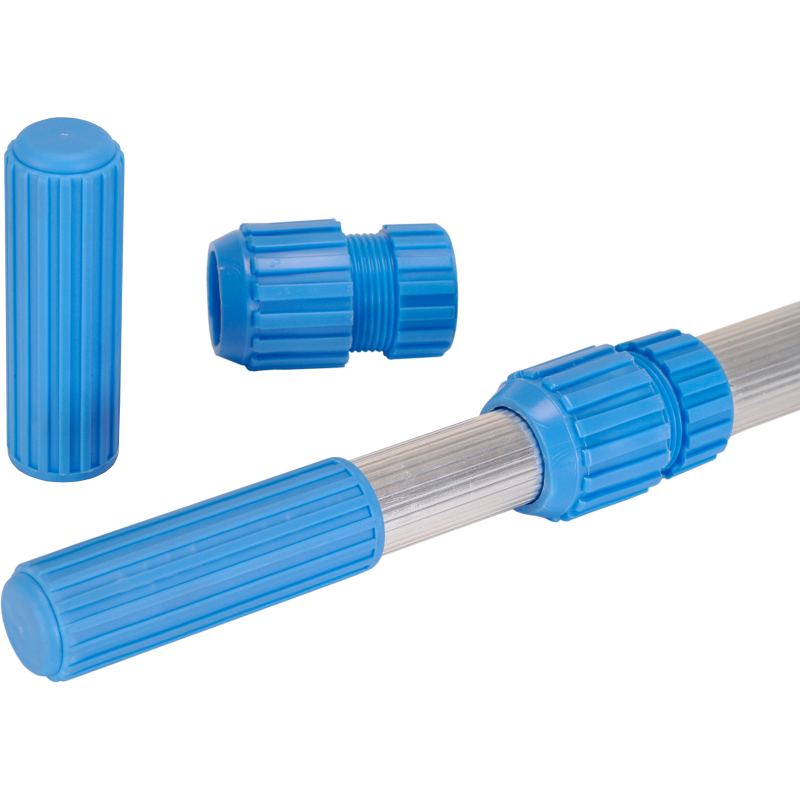A trava para cabo telescópico é o conjunto de peças rosqueáveis que unem dois tubos de aluminio de diametros diferentes, tornando-o telescópico. A pinça é colada no cabo mais grosso e a porca fica livre no cabo mais fino. Ao rosquear a porca na pinça, o comprimento na medida desejada ficará travada. A manete encaixa na extremidade do tubo mais fino, proporcionando conforto no manuseio.